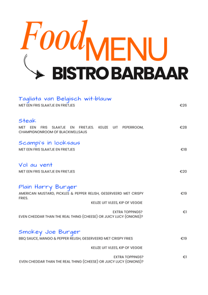 Vanaf nu geniet je bij ons van een vaste menu, dagelijks beschikbaar van woensdag tot zondag. Bij Café Barbaar geldt: bar open = keuken open! Onze nieuwe kaart combineert vertrouwde klassiekers met spannende, vernieuwende gerechten.